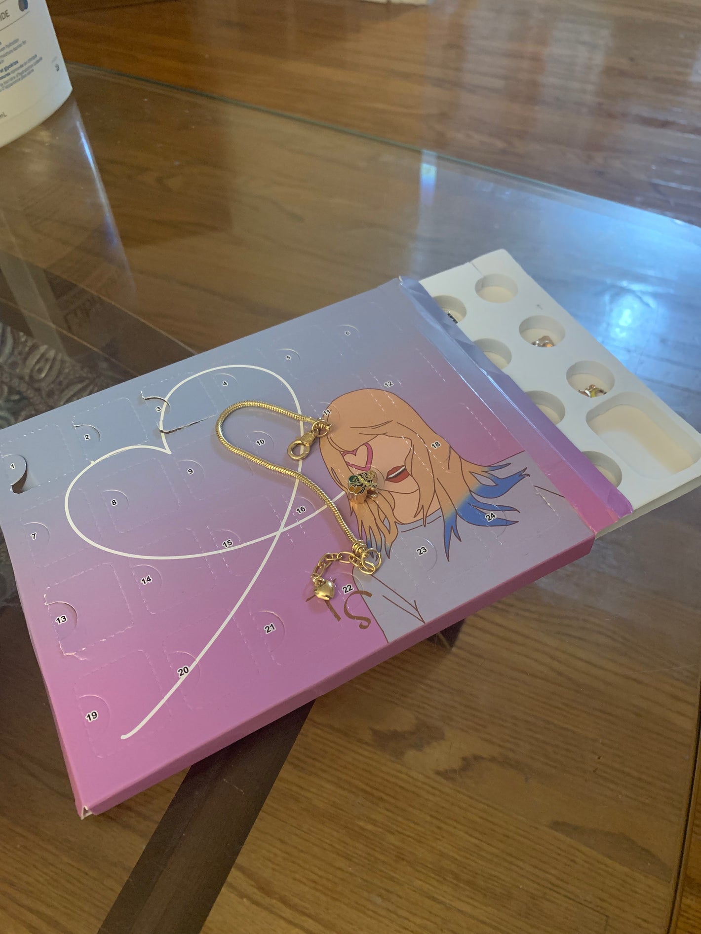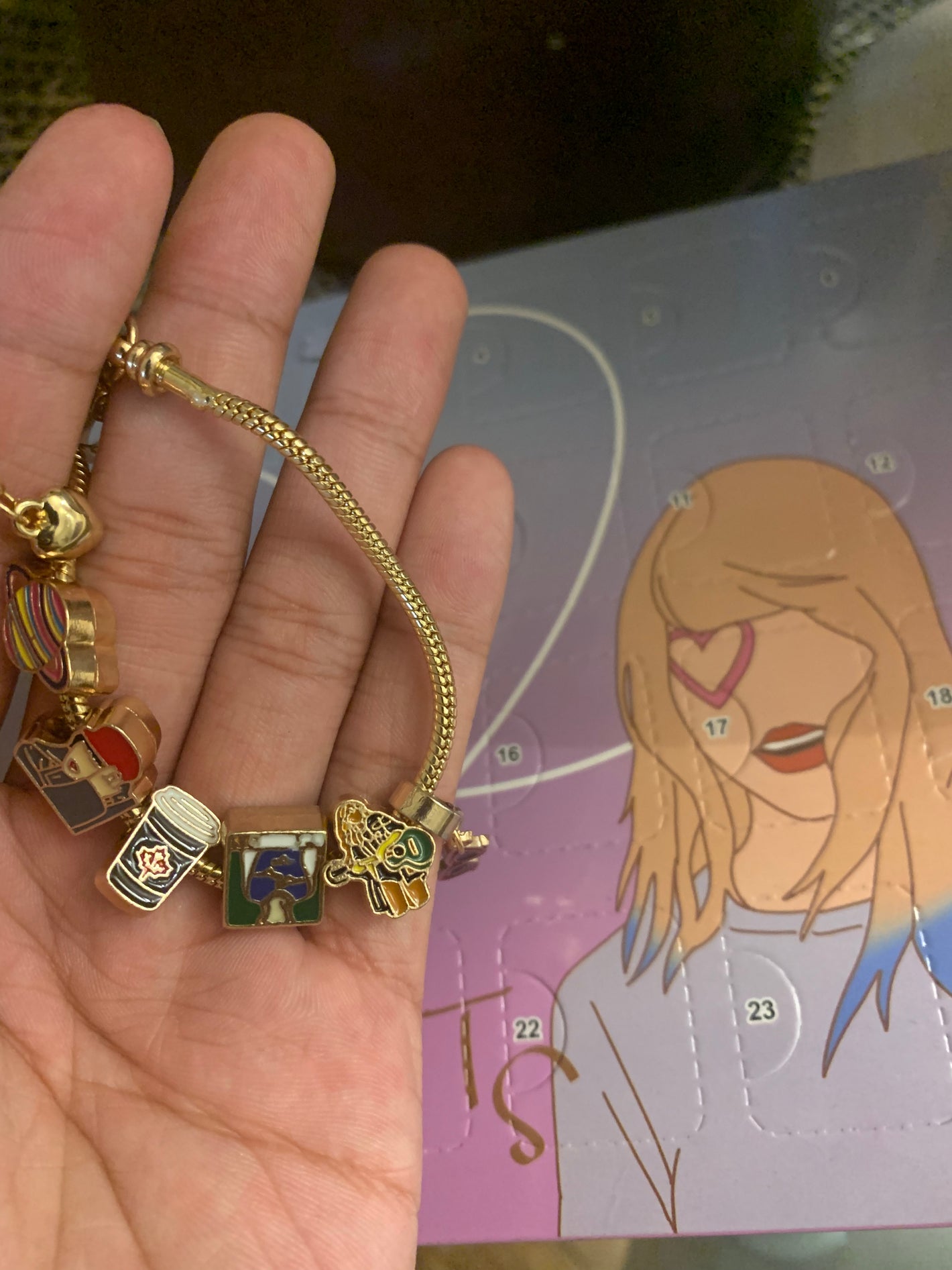 The calendar includes 24 days, each with a unique Taylor Swift–inspired charm.